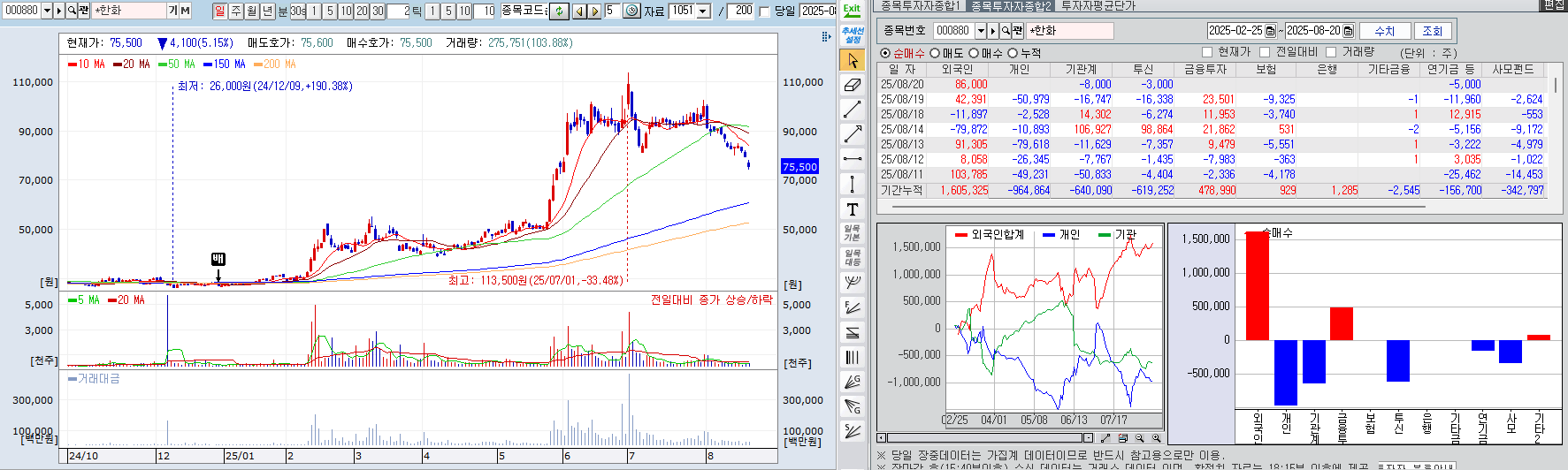 6. 조선 : 상위 3 종목은 여전히 신고가 영역으로 굉장히 강한 모습을 보여주고 있다. 주가 상승과는 별개로 나는 털리고 매수하고를 반복하여 크게 수익을 못 본 업종이다. 작년 말부터 계속 스토리가 양호하고 실적까지 좋았다. 최근까지도 지속하여 뉴스가 나오며 내러티브가 좋다. 그렇다 보니 승률이 안 좋아도 계속 포지션을 확보하고 털리는 것을 반복하고 있다. 한화오션을 보유 중이며 이번 주 급락으로 손실상태이다. 상위종목을 제외하고도 베이스를 다지는 중이지 하락추세로 전환처럼 보이지는 않는다. 포지션 필요하다 한화엔진은 금일 20일 이평선 터치 후 미리 반등을 하였다.. [한화엔진, HD현대마린 엔진 매수]