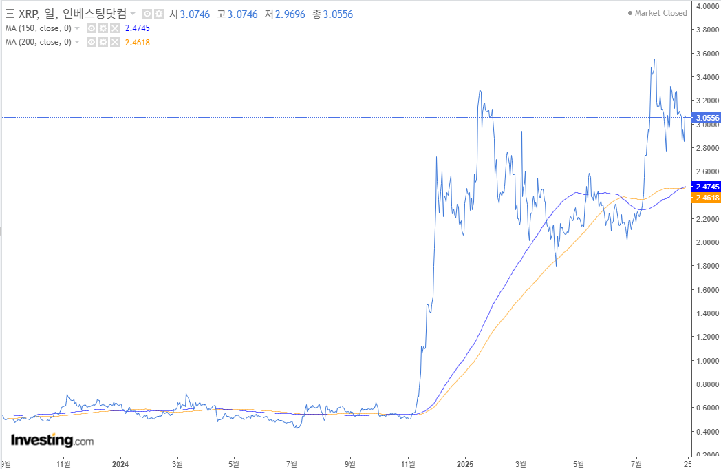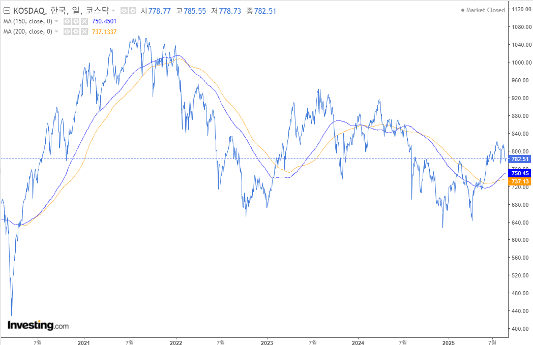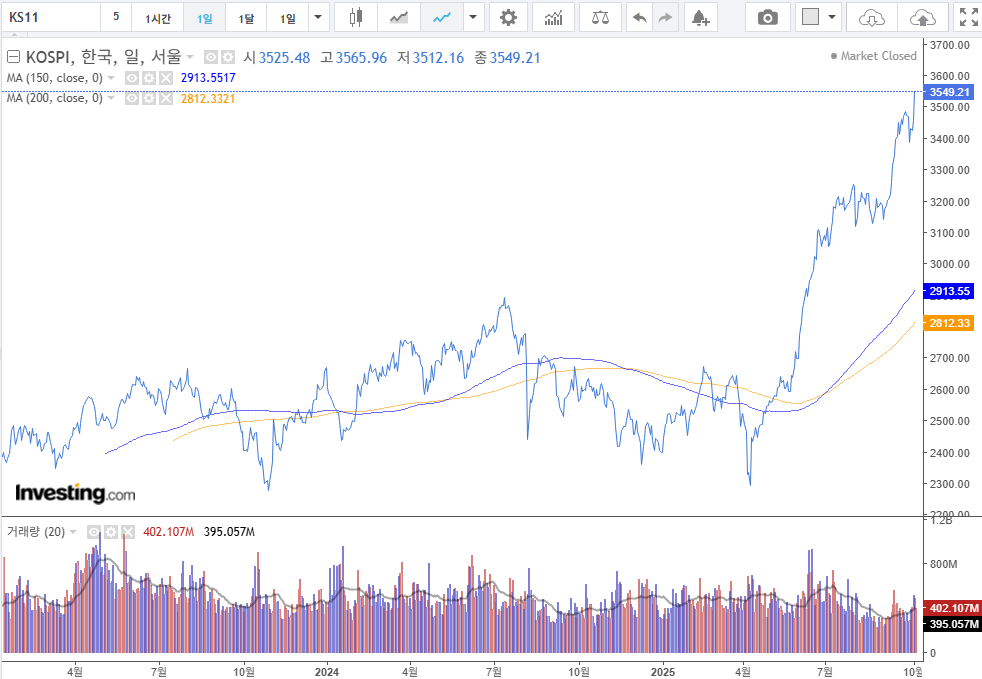 2. 미국 : 신고가 영역이다. 일부 종목들은 쉬어간다. 팔란티어만 날라갔다. 7월에 팔란티어를 마이크로 소프트로 모두 전환하였는데, 눈물이 앞을 가린다. 괜히 손을 놀려서... 지나고 보니 그렇게 되었다. 마소도 사실 실적발표후 급등하였는데 대부분 반납하였다. 그래도 나쁘지는 않으니 그냥 냅둬야겠다. 미국은 세금이 싫어서 최대한 국장위주의 포트를 구성중인데, 상반기에는 코스피가 강해서 미국장보다 더 좋게보였으나, 최근에는 추세가 강한 미국주식이 더 눈에 들어온다. 애플의 장기이평선 돌파가 눈에 들어온다.